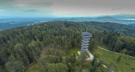 Aussichtsturm Lichtenberg, a man made lookout tower of metal and wood in the Attergau region of Austria, rising high above the local hills in cloudy weather.