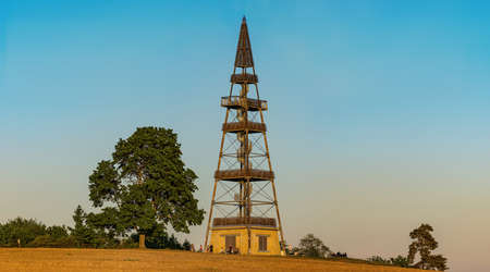 Svetly vrch Lookout Tower stands tall against a blue sky in the Jizera Mountains. Visitors can enjoy panoramic views of the surrounding landscape from this iconic structure.