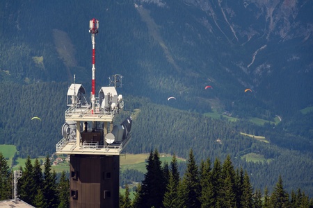 Planai telecommunication tower with flying paragliders in background