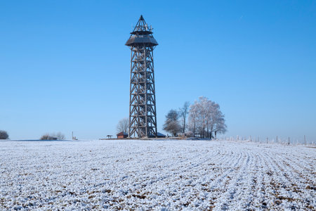 Svetly vrch lookout tower in Albrechtice stands tall in winter. Snow covers the ground as visitors explore this popular spot in the Jizera mountains on a clear day.