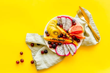 Group of tropical fruits in plate. Exotic breakfast with mango and dragon fruit. Top view