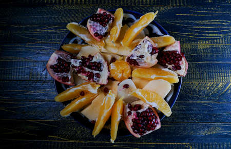 A pomegranate, whole and broken into pieces with other fruits, lies on a marble table close-up