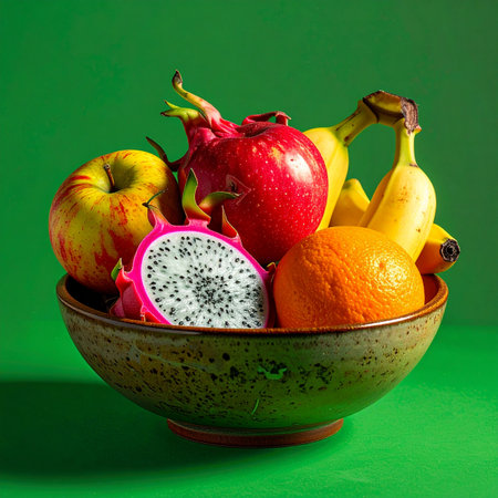 A vibrant collection of exotic and familiar fruits, including a striking dragon fruit, overflows from a rustic ceramic bowl. Set against a bold green background, this colorful still life captures the essence of vitality, natural abundance, and the simple joy of healthy eating.