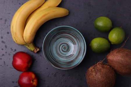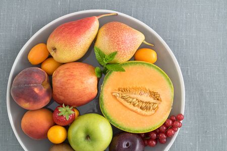 Fresh fruits in a blue bowl on a gray background, selective focus