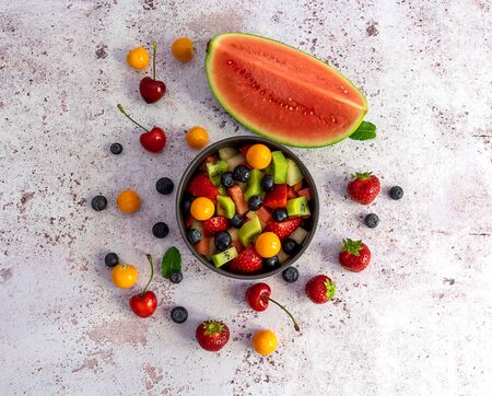 Top view of fruit salad with different berries, kiwi, melon, and watermelon. Summer concept, flat lay