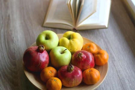 Wooden bowl filled with various seasonal fruit and open book on a table. Selective focus.