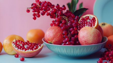 A still life arrangement of fresh pomegranate and red berries in a ceramic bowl, with vibrant colors and a soft pink background, showcasing healthy fruit.