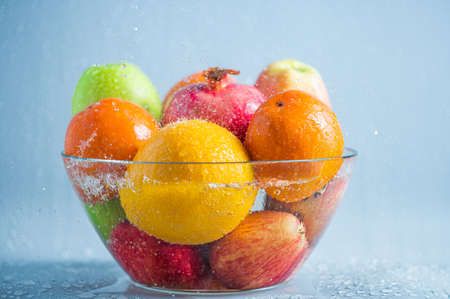 fruit in a transparent dish under a stream of water on a gray background. Washing fruits with water from dirt and chemicals, healthy and natural food.