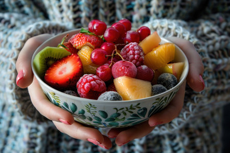 A healthy bowl of organic fruit, held by a human hand generated by artificial intelligence