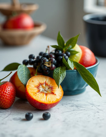 A vibrant arrangement of fresh fruits displayed in decorative bowls against a colorful pastel background, perfect for promoting health, nutrition, and culinary creativity.