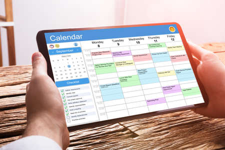 Executive Looking At Calendar On Tablet Computer. Arranging Weekly Schedule