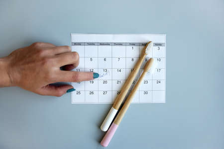 On a light gray background, there is a calendar with a dentist's note and toothbrushes. Dental health concept.