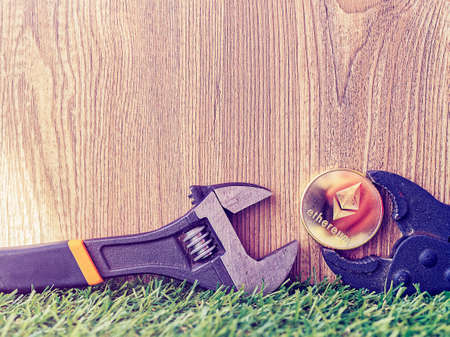 The coin of the crypto currency Ethereum is clamped in a wrench. The objects are on the green grass. Wooden background. The image of hard work in the real and digital world