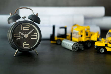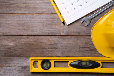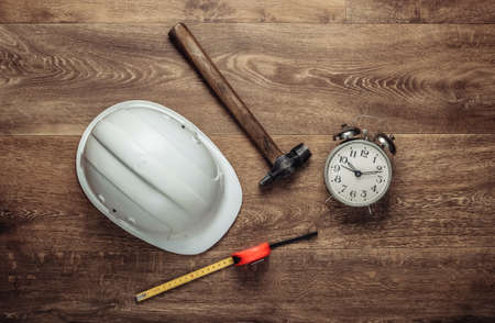 The concept of home repair. Work tool, alarm clock on the floor. Top view