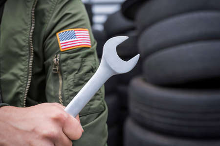Generative AI, Mechanic is holding wrench in the hand, repair service at car workshop garage