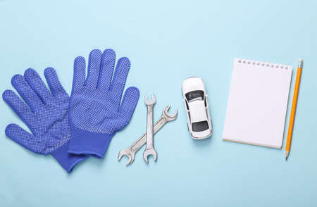 Job mechanic concept. Toy car and Work gloves with wrenches, notebook on blue background. top view. flat lay