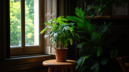 A vibrant houseplant sits beside a sunlit window, casting serene shadows on a wooden stool. This peaceful indoor scene enhances any living space with natural beauty.