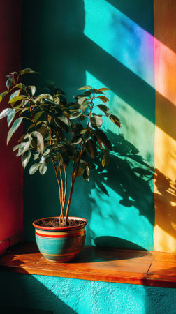 A small green plant in a striped pot rests on a window sill, surrounded by bold, colorful walls and cast shadows from the sunlight.