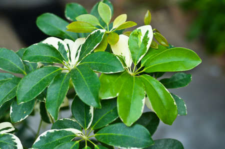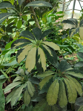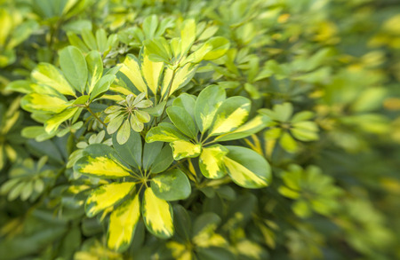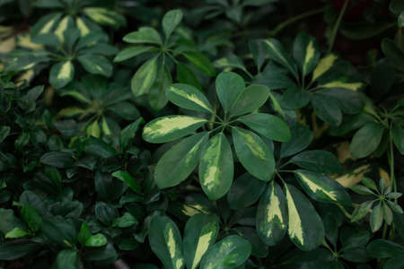 Natural background of Schefflera Arboricola (Variegated) or dwarf umbrella. The leaves are arranged in circles like umbrella spokes, with greenish-white and yellow in the tropical garden.