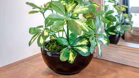 Schefflera arboricola plant isolated on wooden background