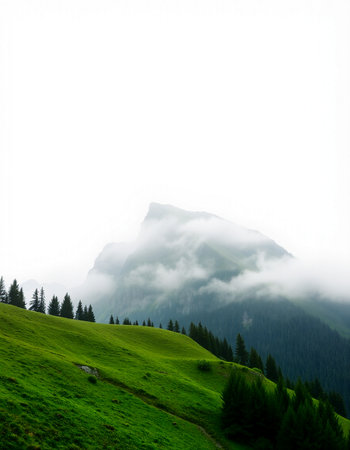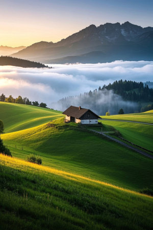 A misty morning in the mountains of Switzerland, with rolling hills and forests shrouded by fog, creating an ethereal atmosphere. The photograph captures the serene beauty of nature's tranquility. --ar 3:2 --v 6.1 Job ID: 7b93aa38-cba9-4afe-9609-19f108f7f677