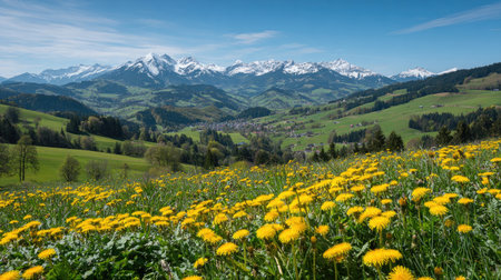 Landscape with dandelions in the foreground and Alps in the background