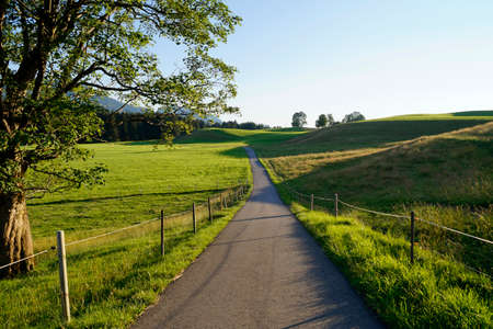 green meadows of the Allgau region in Bavaria with the Alps in the background (Nesselwang, Allgaeu, Germany)