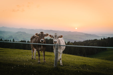 two cows looking at camera - different colored animals with sunset
