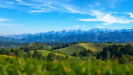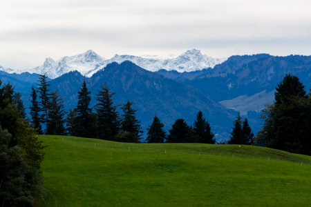 Panoramic view of countryside, green alpine meadows and the Alps mountains in Switzerland
