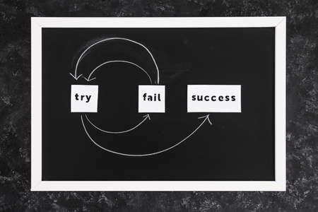 try, fail, repeat, success text with circular arrows on small blackboard