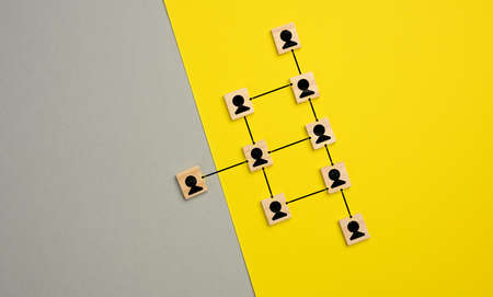 Chain of people figurines connected by white lines. Cooperation and interaction between people and employees. Dissemination of information in society, rumors.