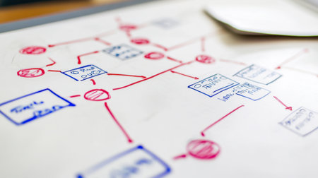 Dynamic whiteboard filled with colorful sticky notes and flowcharts representing ideas and processes, ideal for showcasing collaboration and creative thinking in modern environments.