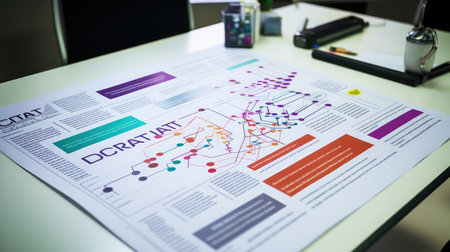 Vibrant flowchart on a wooden desk illustrates a creative approach to project planning, emphasizing organization and effective communication through vivid color-coding.