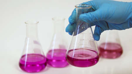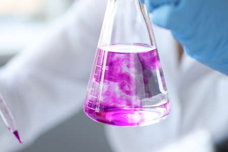 The scientist wear blue nitrile gloves holding Erlenmeyer Conical flask, with purple violet solvent forming reaction boric acid and ammonia solution analysis in wastewater sample. Selective focus.