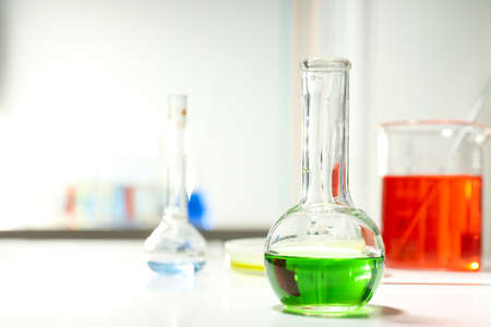 Pharmacy and chemistry theme. Test glass flask with solution in research laboratory. Science and medical background. Laboratory test tubes on dark toned background, science research equipment concept