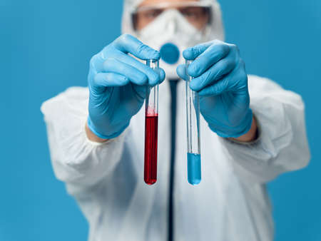 male doctor laboratory analyzes research coronavirus blue background