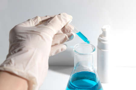 Hand of unrecognizable chemical researcher in rubber glove holding beaker of blue substance against white background