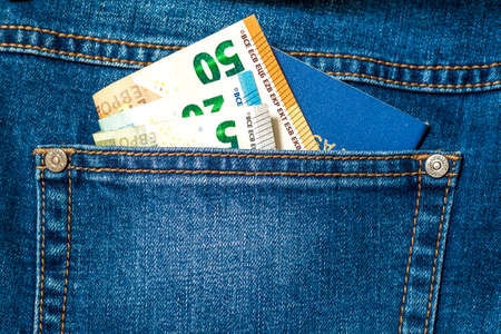 Euro money banknotes and travel passport in a pocket of blue jeans close up