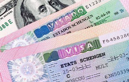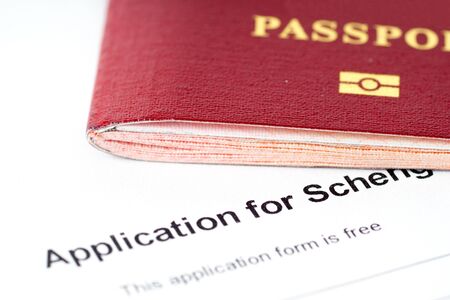 Close-up of clipboard with application for schengen visa document and passport with banknotes. Paper for applying to entry in european union. Travelling abroad concept
