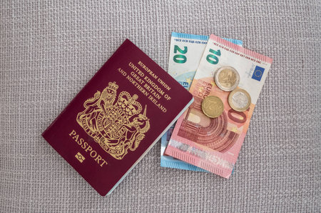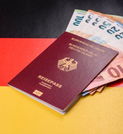 Passport with coins on the background of the Euro Union flag. Travel or emigration theme