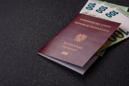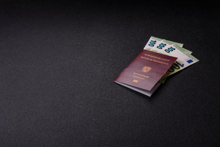 Red Biometric passport is on paper euro bills. Concept- increase of salaries, work in Europe, Immigration to work, visa for Europe.European passport lying on top of 200 Euro banknotes.