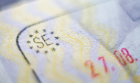 Stockholm, Sweden - November 2019: Close-up macro detail of European Union admission stamp