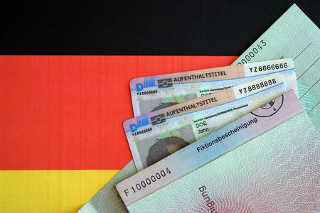 KYIV, UKRAINE - AUGUST 31, 2025 German Permanent resident card and document specimen lies on wooden table close up. Aufenthaltstitel and Fiktionsbescheinigung