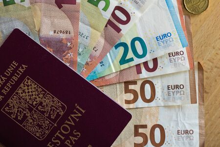 Dutch passport with Euros in it. Five, ten, twenty and fifty Euros