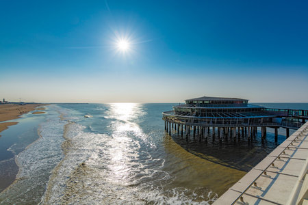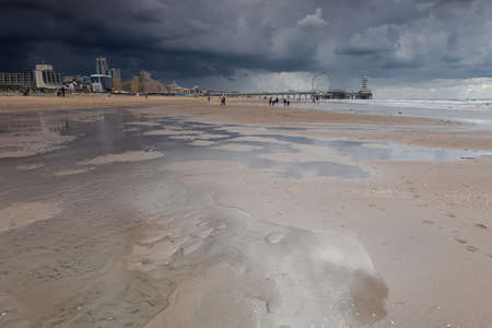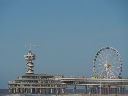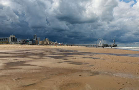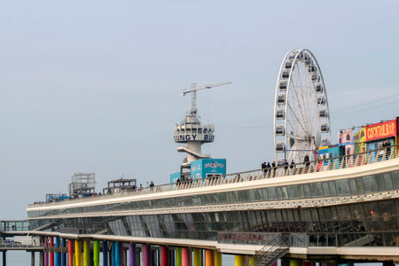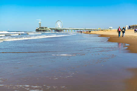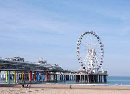 The Scheveningen Pier Strandweg beach in The Hague with Ferris wheel. The Hague, Netherlands