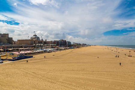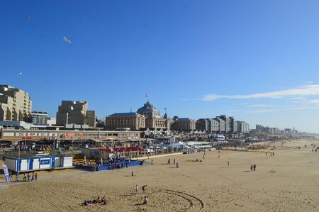 July- 18- 2020. Panorama view of Scheveningen Beach in Netherlands, with buildings and walking tourists, on a beautiful sunny day. Photo taken from pir.