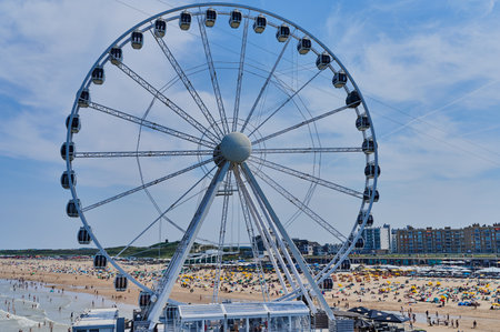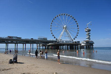 Scheveningen, Netherlands - August 10, 2020: ferris wheel and people at the famous beach in Scheveningen, Netherlands.