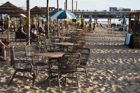 July- 18- 2020. Empty tables and chairs, on Scheveningen beach at North Sea, Netherlands.