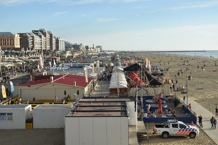 The Hague, The Netherlands - August 7, 2016: High angle view of the beach of The Hague. Summer at sunset. Space for copy