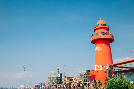 Siheung, Korea - July 9, 2020 : Oido red lighthouse and seaside restaurants
